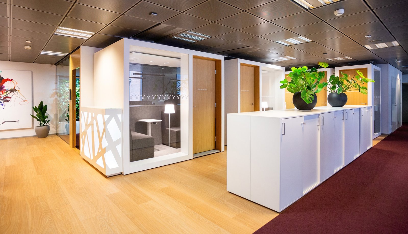 POD 2 on hiljainen työ- ja neuvottelutila 1-2 henkilölle, joka tarjoaa rauhallisen ja yksityisen ympäristön sekä yksintyöskentelyyn että spontaaneihin kokouksiin. Tarvittaessa tila voidaan mukauttaa jopa neljän hengen kokoushuoneeksi.