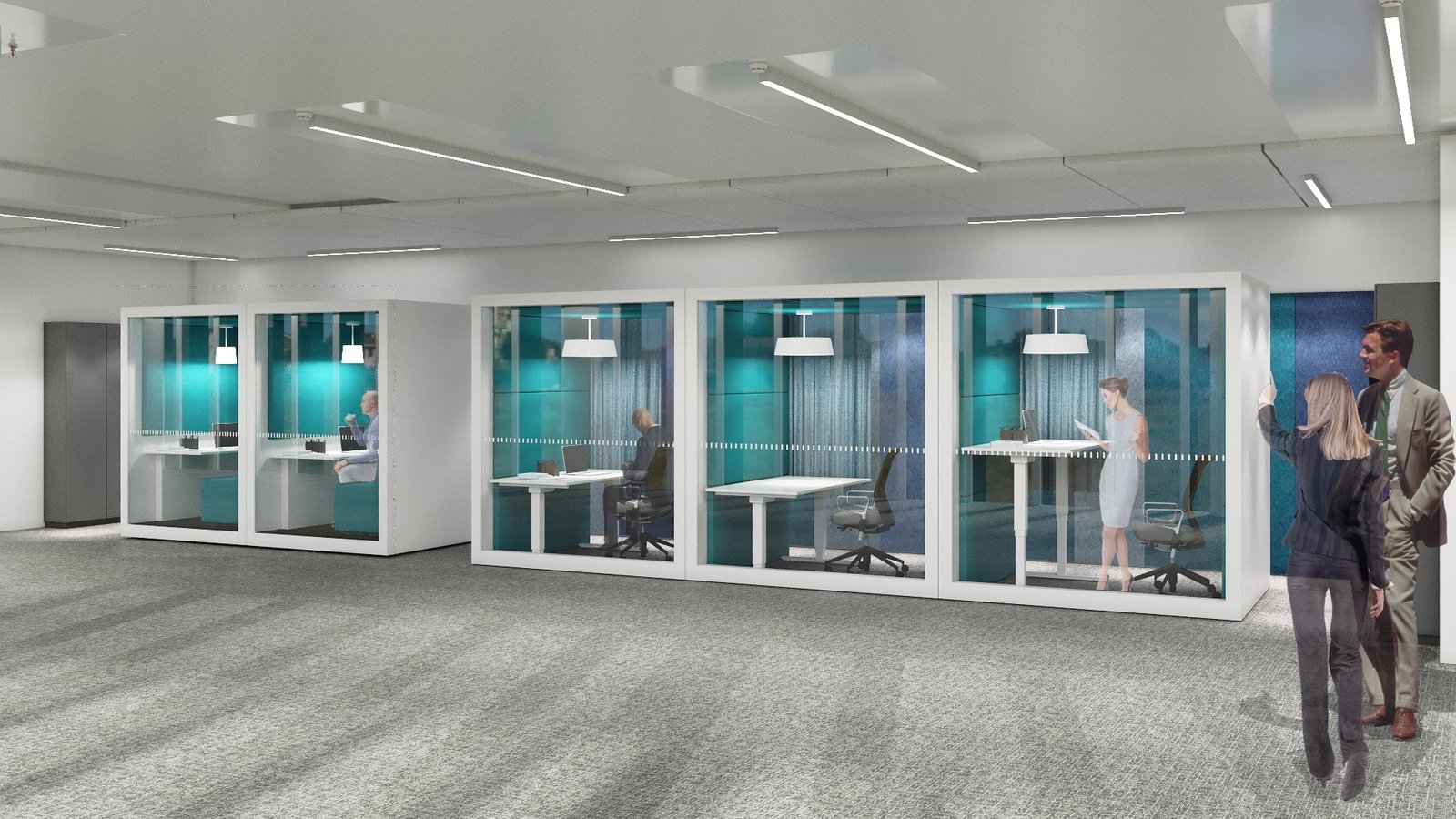 New products we will bring to the fair POD OPEN and POD ROLL DUOn. POD OPEN is a working space for 1-4 people, depending on the furniture solutions. It is an open space with acoustic panels on the walls and ceiling and a sound-absorbing curtain for privacy and peace of mind. The space is fully accessible.