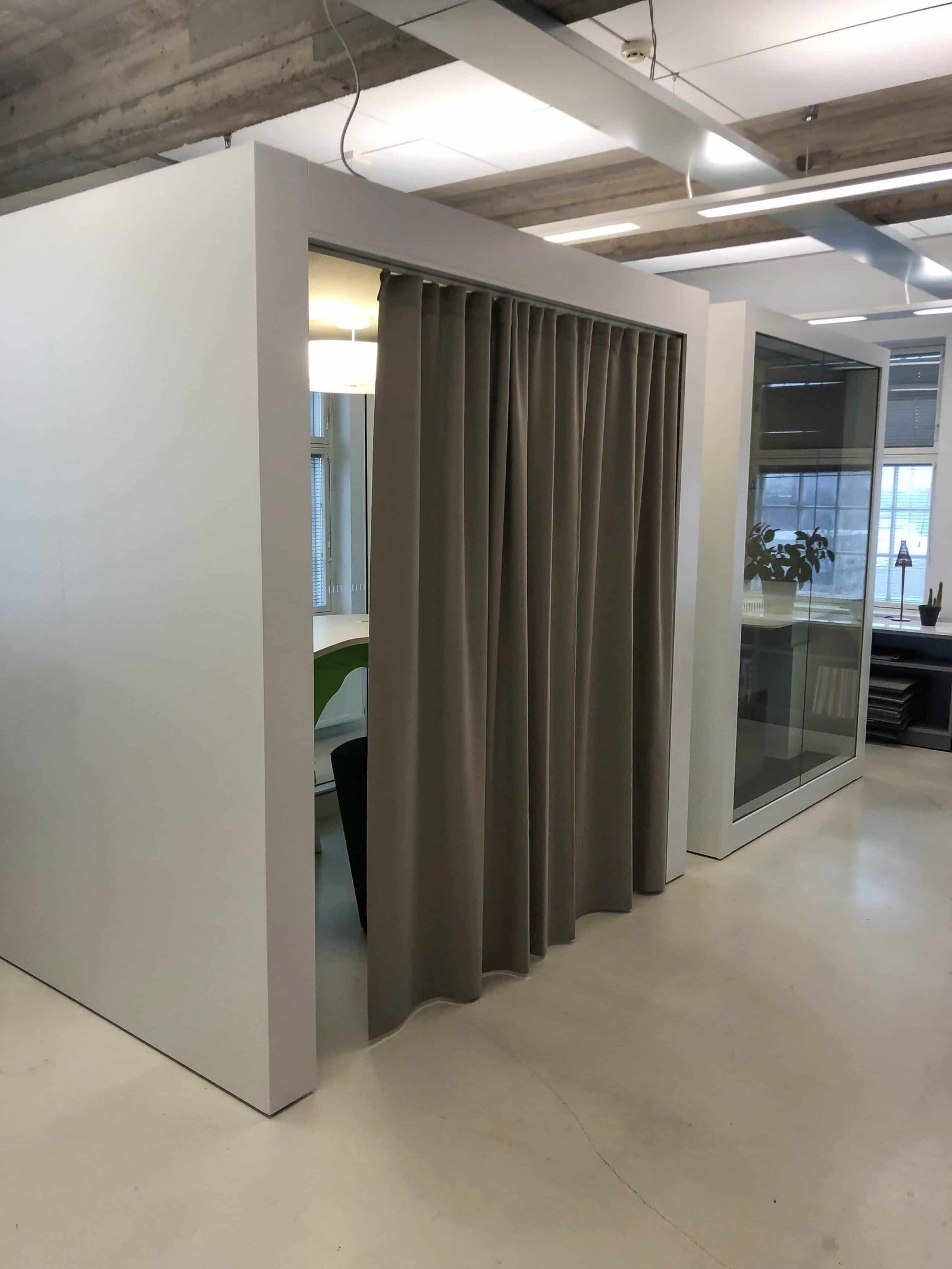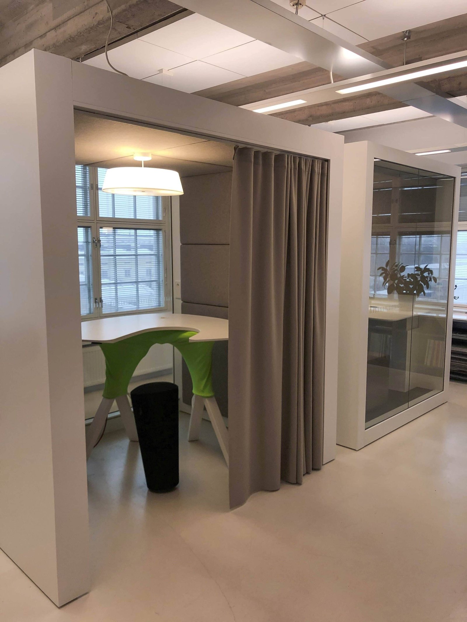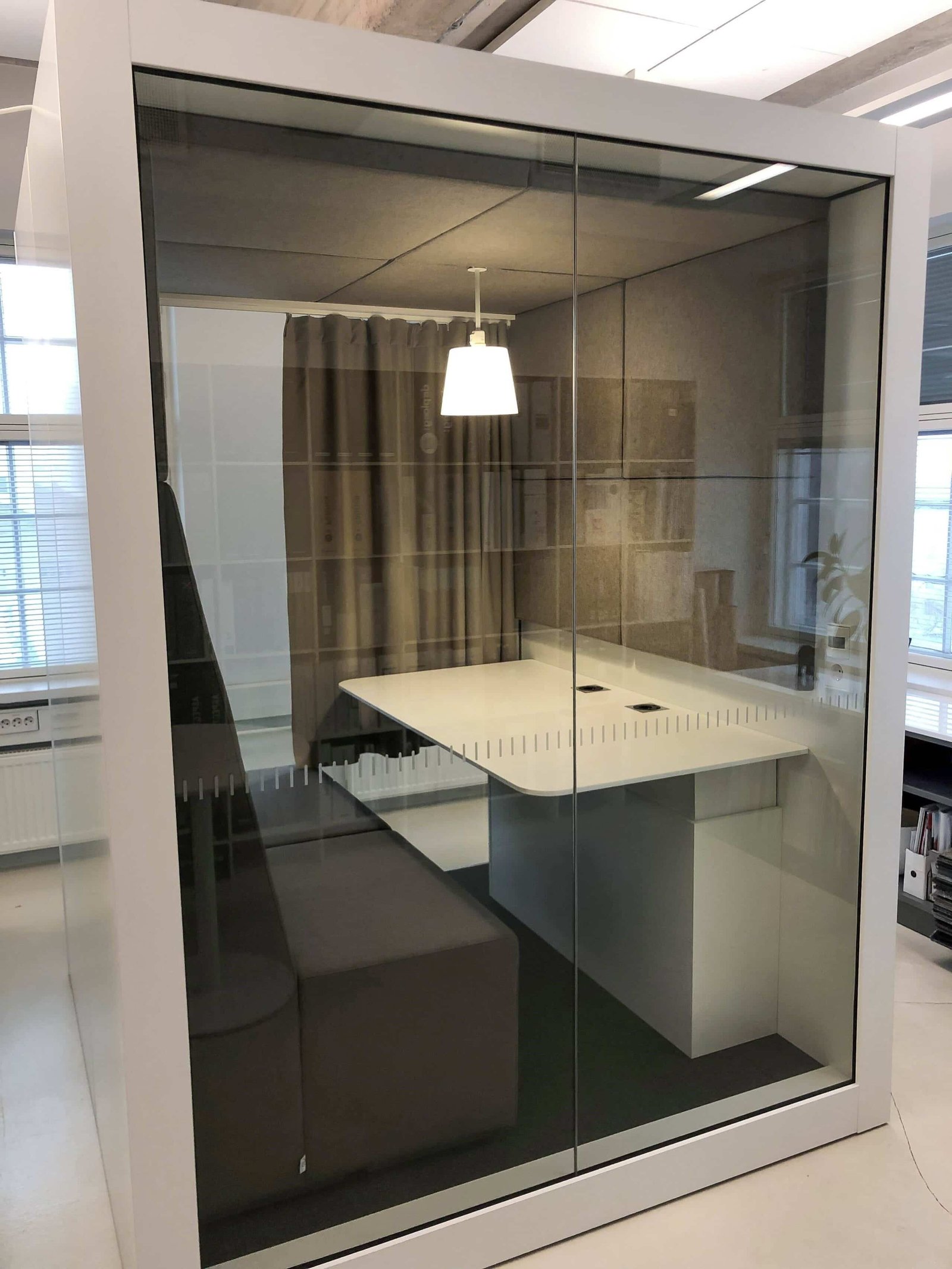 POD OPEN is a floorless and fully accessible pod room. It comes with a fixed pendant light, a light-activated motion sensor and two power sockets to charge your electronic devices. The ceiling and walls are covered with acoustic panels to create the best possible acoustic environment.