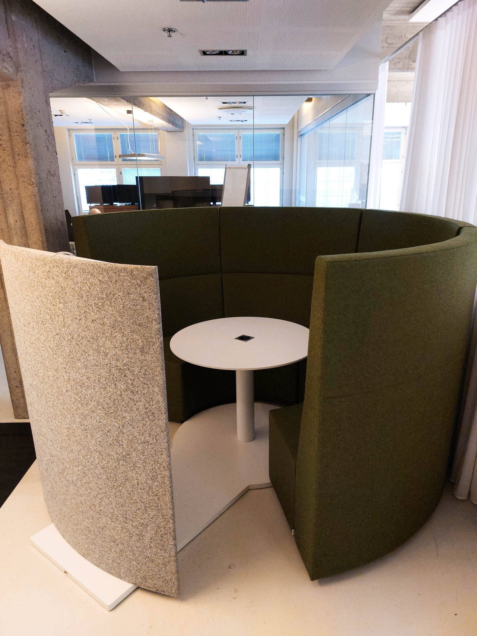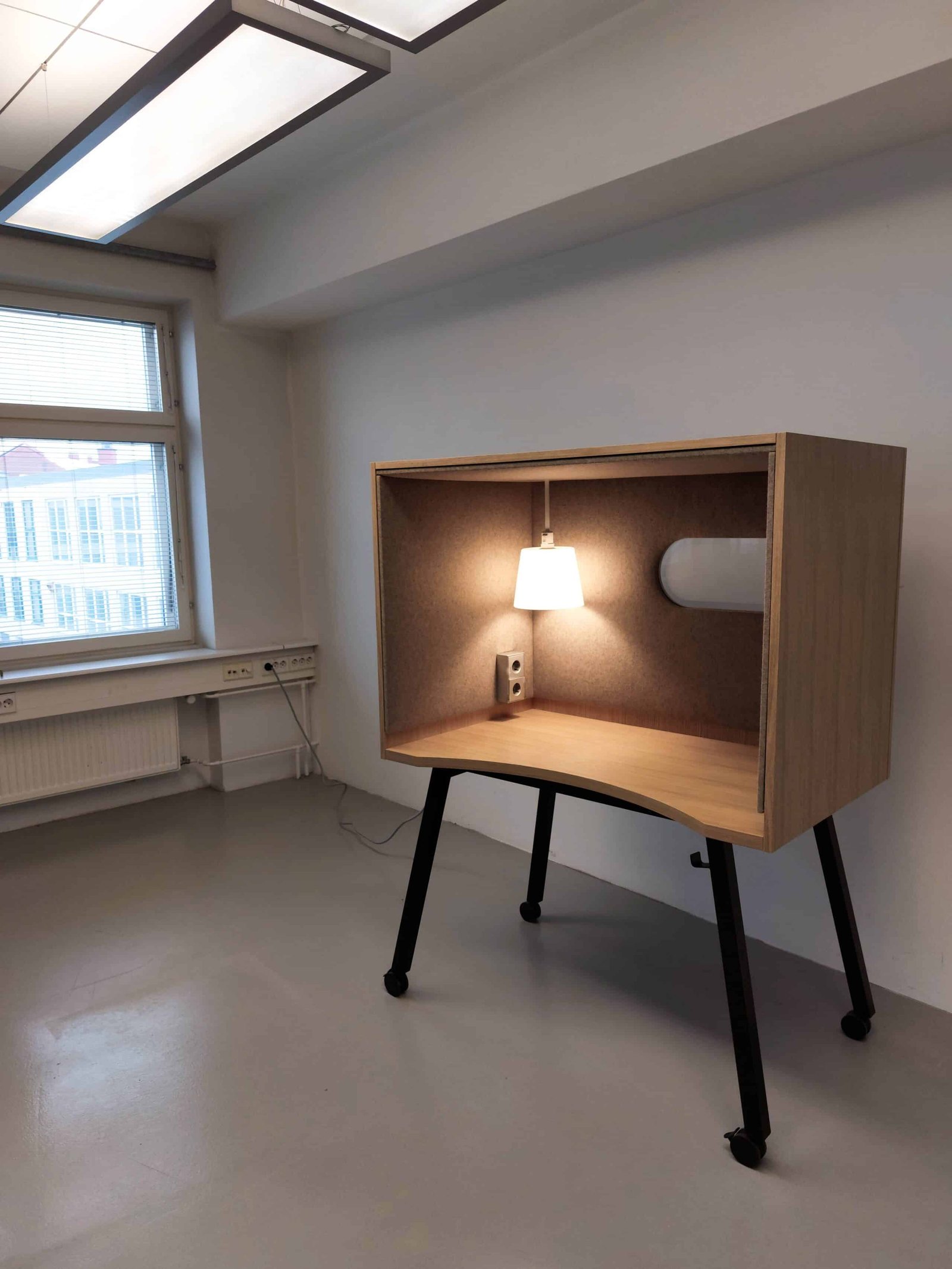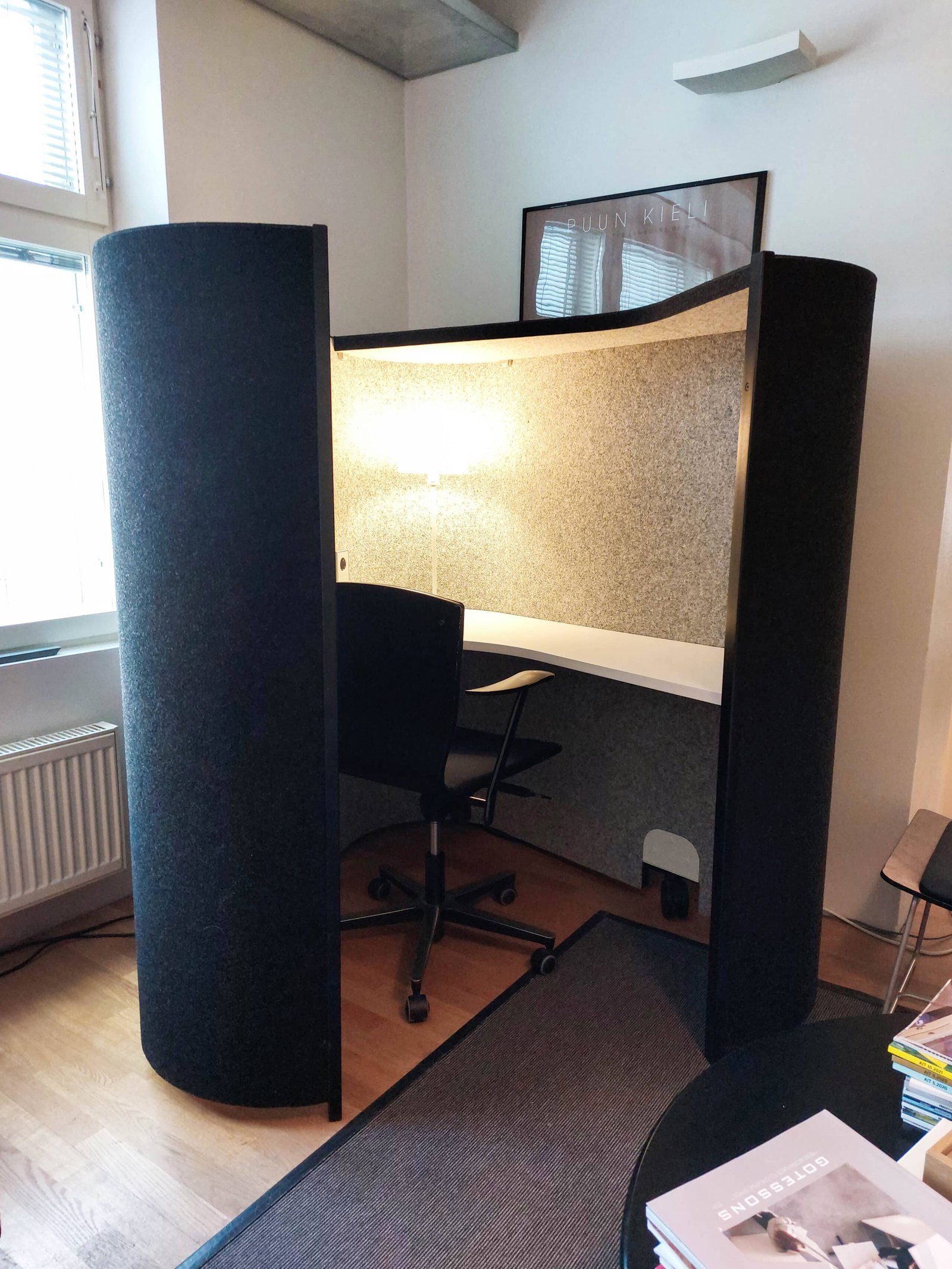 We also received a ROLL IN table solution for our showroom. This ROLL IN has an oak top and oak table top combined with black steel legs. The inside of the shelter surrounding the table is upholstered with an acoustic panel to provide the user with an acoustically comfortable environment. ROLL IN also features acrylic opaque glass to let light through.