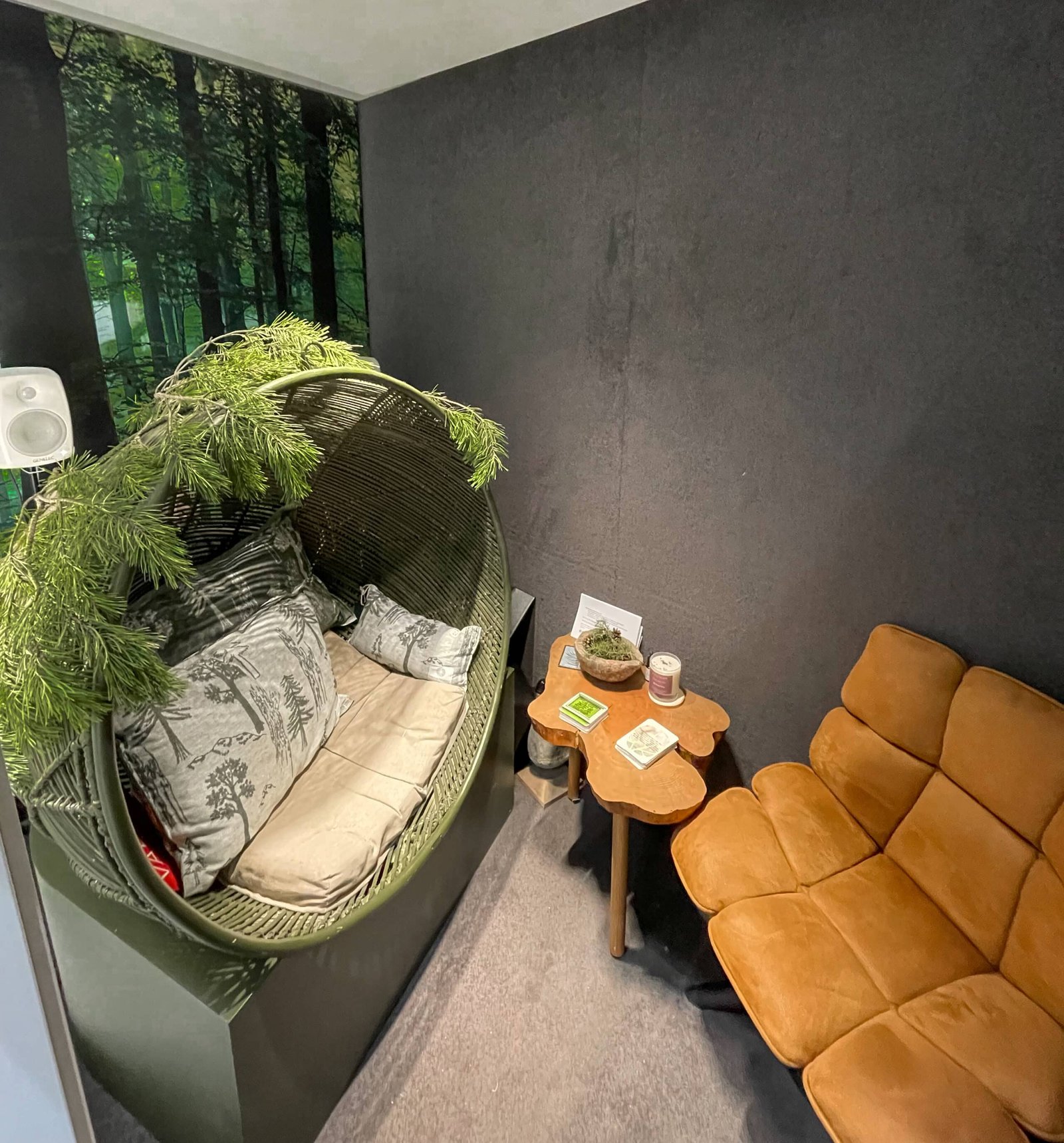 POD 2 -huone oli sisustettu rentouttavilla metsäaiheisilla teippauksilla ja luonnollisilla väreillä. POD 2-huone on akustisesti miellyttävä ympäristö, joka takaa käyttäjälleen yksityisyyden.