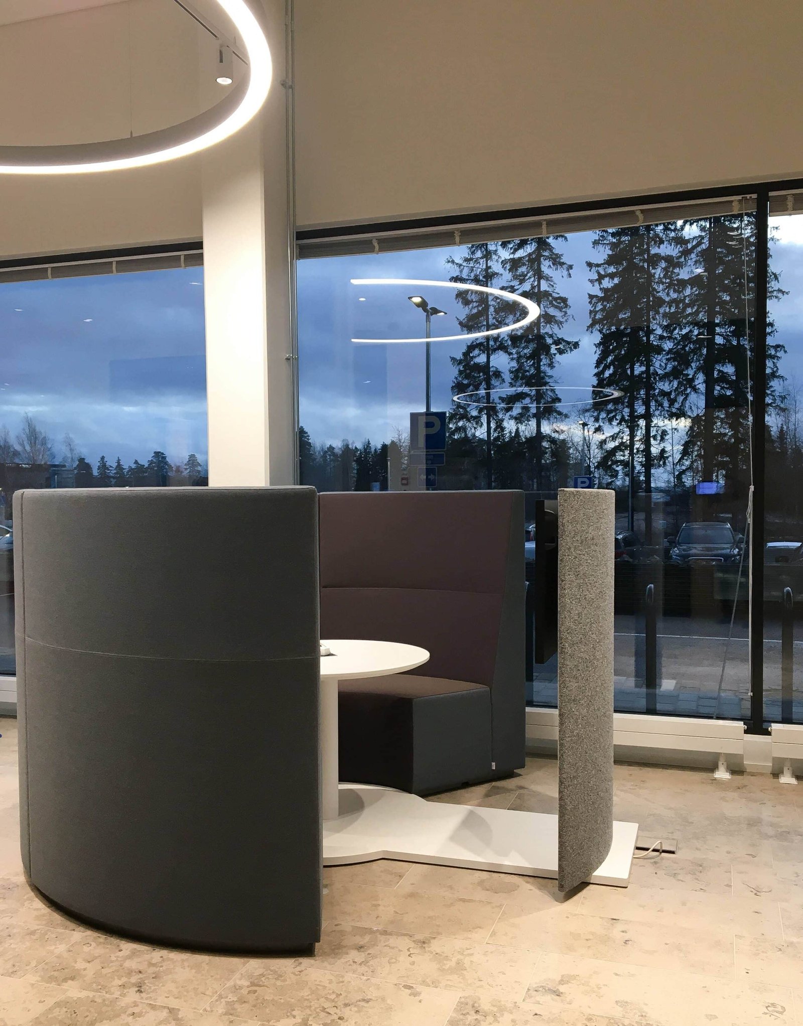 Bosch headquarters moved to a new building in Vantaa in 2019. Bosch's two-storey premises received much-needed colour and functional solutions for working with INTO products. The large exhibition, meeting and training rooms on the lower floor have a look and feel in line with Bosch's international branding, with the understated POINT sofas and CUP furniture in subtle colours.