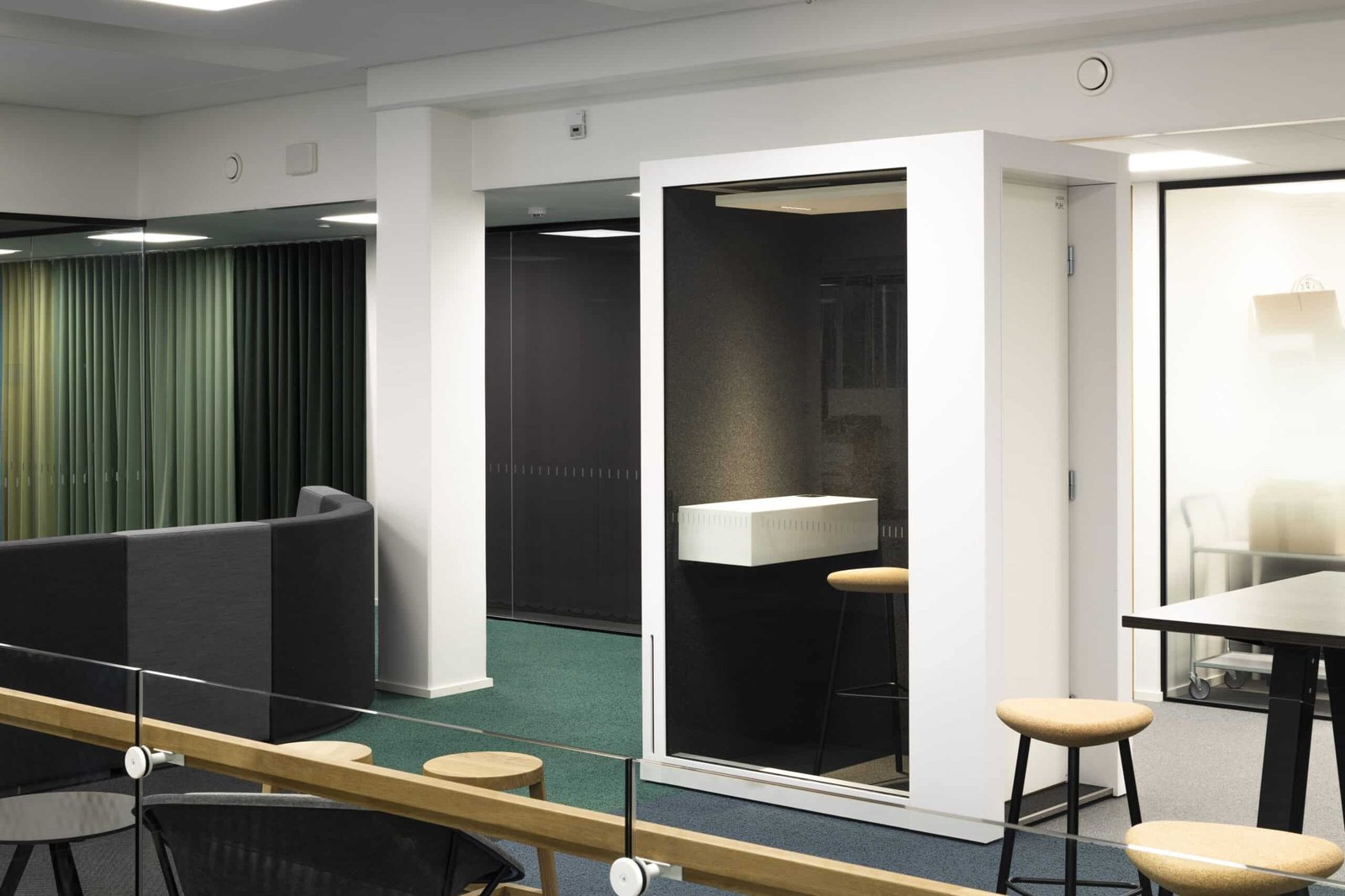 On the second floor, a cosy workspace is an open-plan, multi-purpose office for around 75 employees, and they wanted to add colour and support spaces that would allow them to work in peace. POD rooms work well in the space, providing privacy and peace of mind, and allowing small groups to meet in a quiet environment. POD PHONE booths can be used to make business calls without disturbing colleagues, while the POD ROLL workspace makes it easy to hold meetings or video conferences, for example.