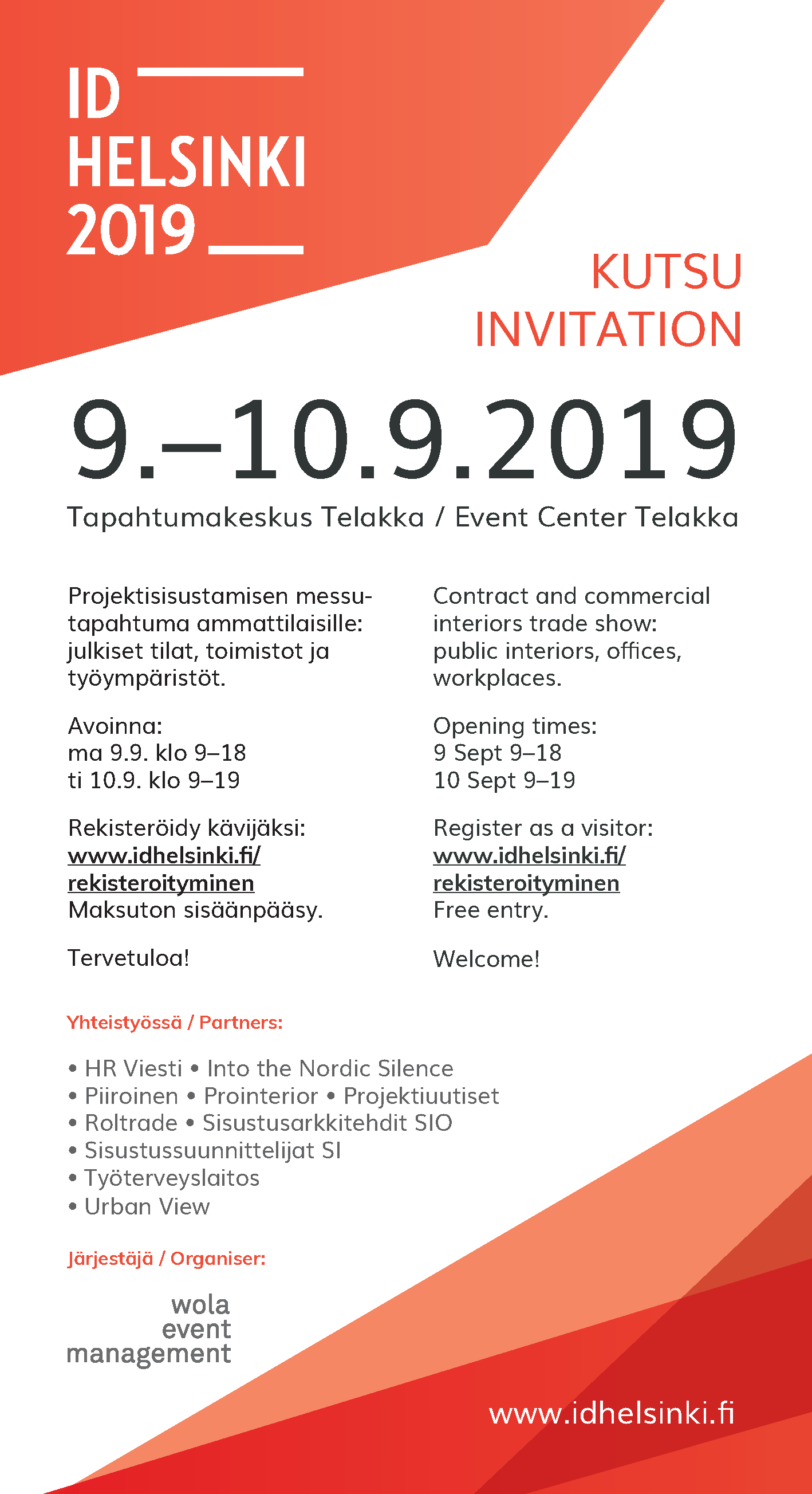 ID Helsinki on Suomen johtava projektisisustamisen tapahtuma, joka keskittyy julkisiin tiloihin, toimistoihin ja työympäristöihin. Kaupallisessa, rennon intensiivisessä tunnelmassa kohtaavat tavarantoimittajat ja palveluntarjoajat, suunnittelijat sekä projektisisustamisen asiakkaat.
