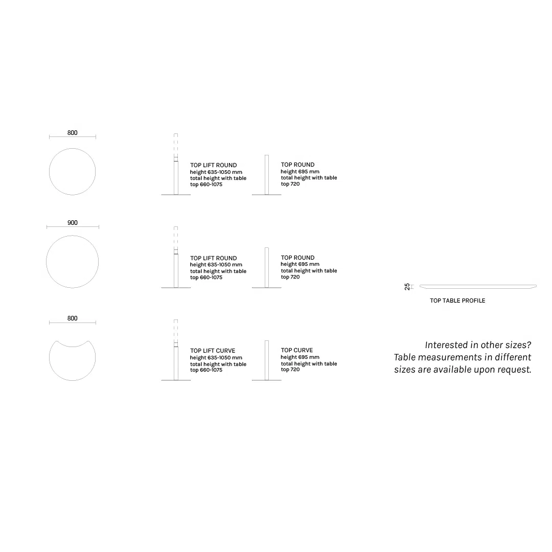 TOP ROUND-pöytien jalkavaihtoehdot:
