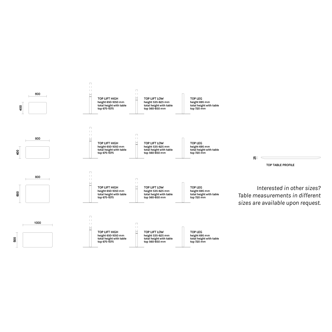 TOP-pöydät ovat visuaalisesti siroja, mutta rakenteeltaan tukevia apu-, sohva- ja työpöytiä, jotka mahdollistavat ergonomisen ja joustavan työn. Pöydät ovat saatavilla kiinteällä tai korkeussäädettävällä jalalla.