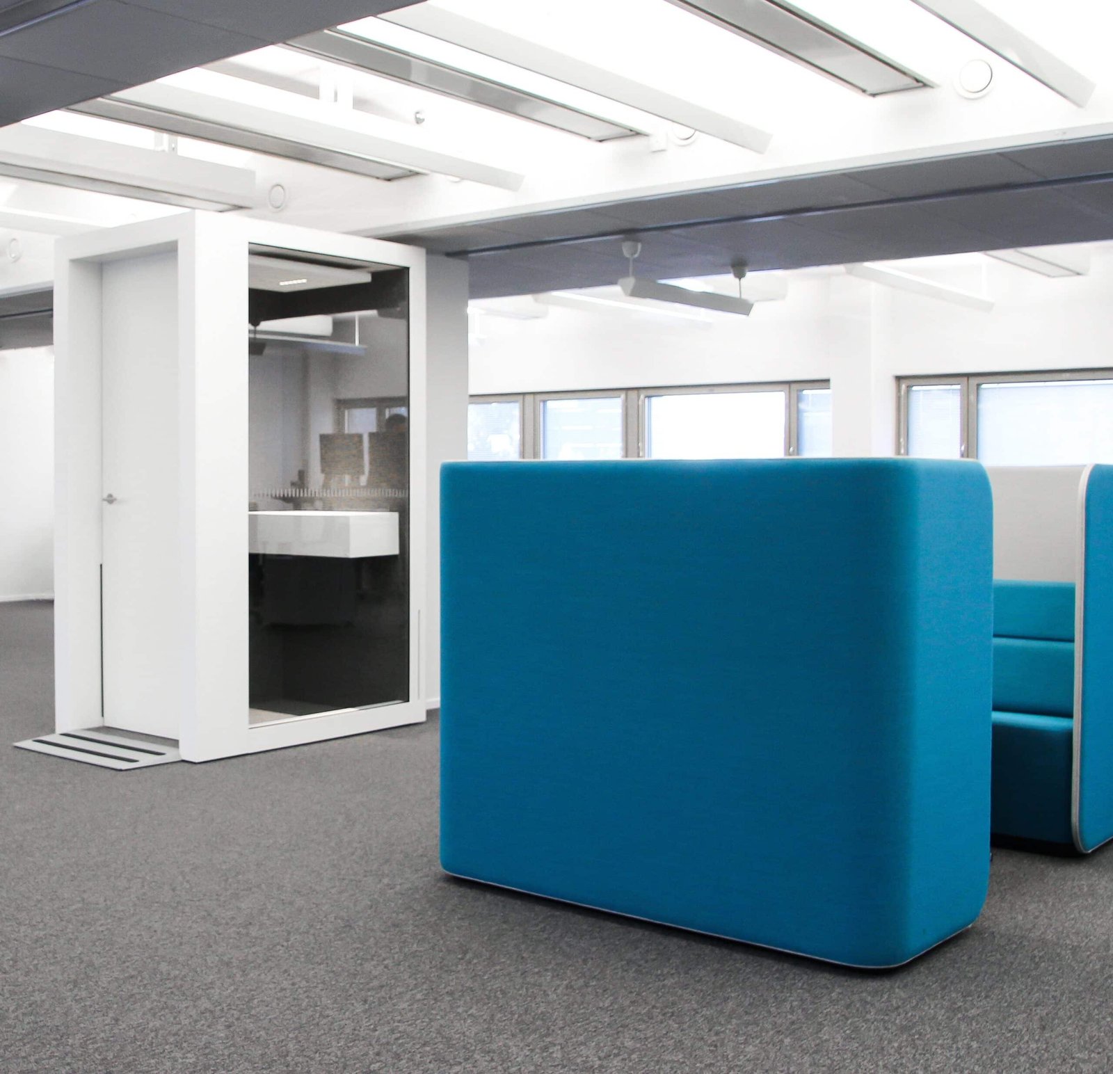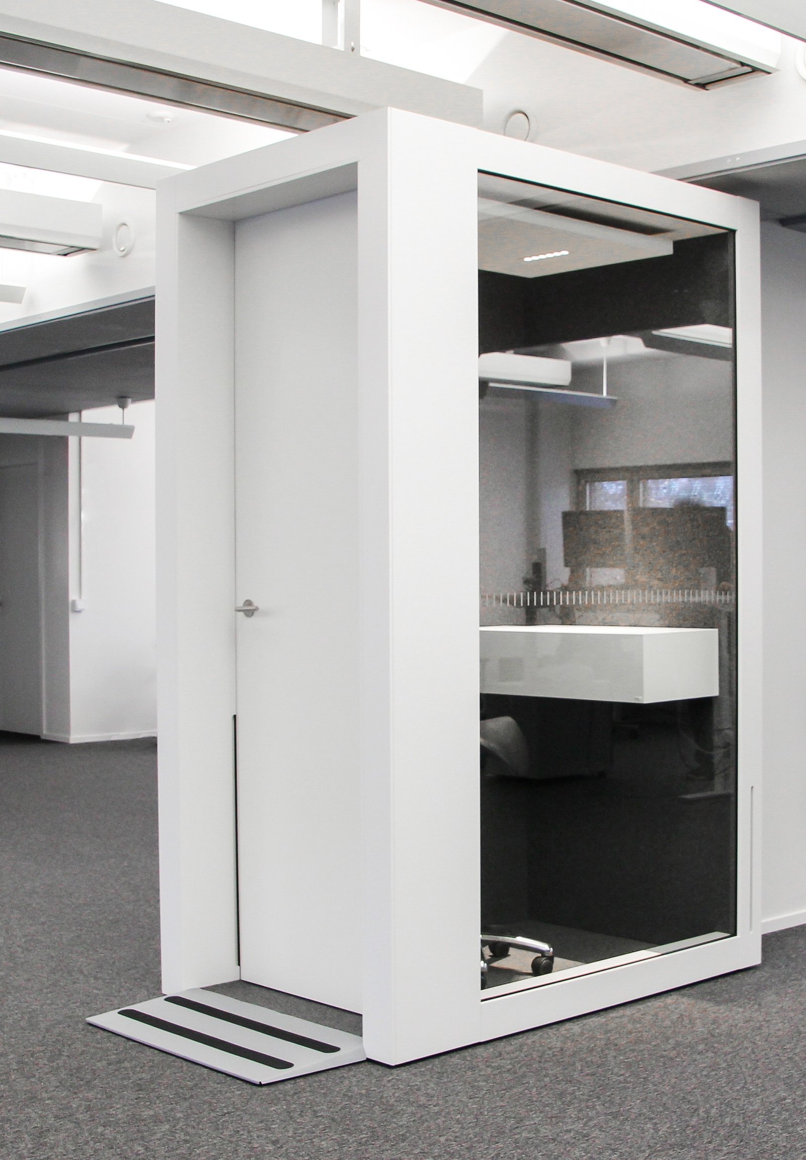 POD PHONE puhelinkopit sijoitettiin keskelle avotiloja, jotta ne olisivat helposti kaikkien saavutettavissa. Puhelinkopit tekevät tiloista monikäyttöiset ja tarjoavat yksityisyyttä puheluiden ja nopeiden online-tapaamisten ajaksi. Jotta POD PHONE puhelinkopit sopisivat kaikkien työntekijöiden käytettäväksi, lisättiin niihin pyörätuolirampit helpottamaan liikkumista.